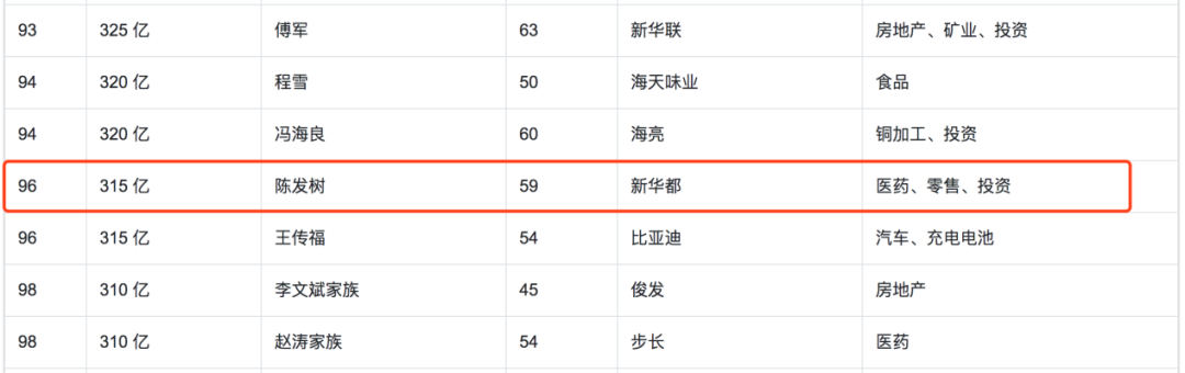 根據(jù)2009年福布斯中國(guó)富豪榜,閩籍商人陳發(fā)樹(shù)以218.5億元的個(gè)人財(cái)富位列11位,成為福建首富。另?yè)?jù)2019年胡潤(rùn)百富榜顯示,福建排名第一的為許世輝家族,身家達(dá)600億元,陳發(fā)樹(shù)則以315億元位列全國(guó)榜96位,位列福建榜第5位。